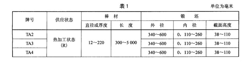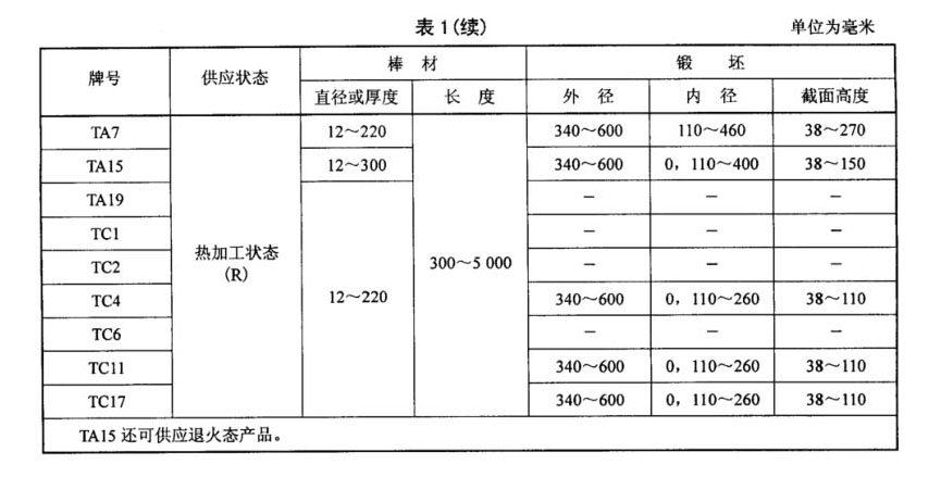 棒材和鍛坯牌號(hào)、狀態(tài)和規(guī)格應(yīng)符合表1的規(guī)定。其中TA15鈦合金棒材根據(jù)用途分為兩個(gè)類(lèi)別: