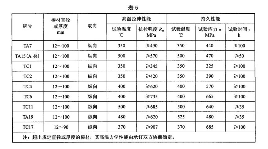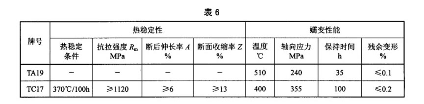 3.4.3 訂購(gòu)方要求并在合同中注明時(shí),鈦合金棒材的高溫拉伸、持久性能應(yīng)符合表5的規(guī)定,TA19和TC17鈦合金棒材的熱穩(wěn)定性和高溫蠕變性能應(yīng)符合表6的規(guī)定。