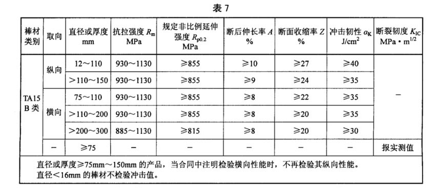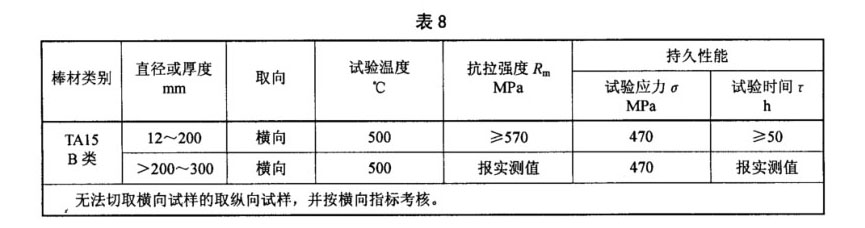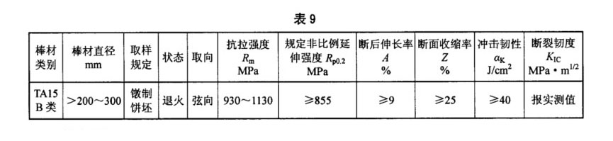 3.4.4 B類(lèi)用途的TA15鈦合金棒材,其室溫力學(xué)性能在退火態(tài)棒材上或經(jīng)熱處理后的棒坯(一段棒材)上取樣測(cè)試。其室溫力學(xué)性能應(yīng)符合表7的規(guī)定,高溫力學(xué)性能應(yīng)符合表8的規(guī)定;當(dāng)訂購(gòu)方要求并在合同中注明時(shí),直徑大于200mm的棒材應(yīng)取樣鐓制餅坯,餅坯的室溫力學(xué)性能應(yīng)符合表9的規(guī)定。