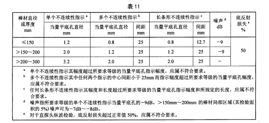 3.6.2 B類(lèi)用途的TA15鈦合金棒材,應(yīng)按本規(guī)范的附錄A進(jìn)行徑向縱波、周向橫波檢驗(yàn)。徑向縱波檢驗(yàn)允許的缺陷當(dāng)量值見(jiàn)表11,周向橫波檢驗(yàn)不允許存在任何超過(guò)人工傷反射幅度的信號(hào)。