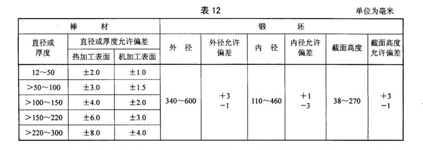 3.7.1 棒材和鍛坯以磨削或機(jī)加工表面供貨。當(dāng)訂購(gòu)方要求并在合同中注明時(shí),棒材也可以熱加工表面供貨。棒材和鍛坯的尺寸允許偏差應(yīng)符合表12的規(guī)定。