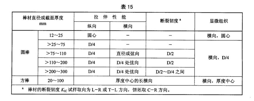 4.2.2.3 B類(lèi)用途TA15鈦合金棒材的取樣位置還應(yīng)符合表15的規(guī)定,直徑大于200mm的棒材當(dāng)訂購(gòu)方要求并在合同中注明進(jìn)行鐓制餅坯檢驗(yàn)時(shí),從每根受檢棒材上截取長(zhǎng)度為60mm±3mm的毛坯。
