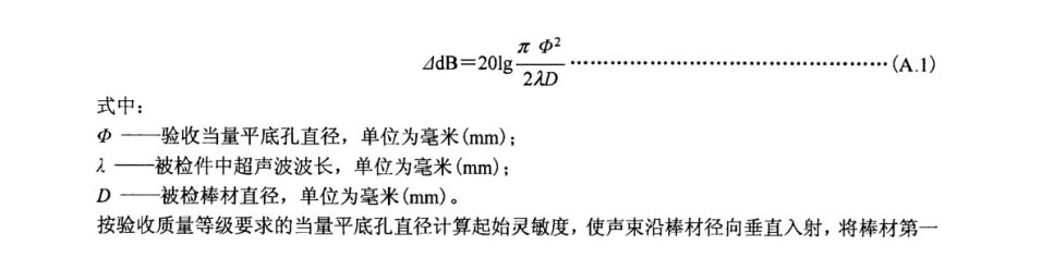 A.4.1.1 調整儀器靈敏度(水浸法檢驗時,可同時調節水距),使來自試塊中任何一個平底孔的反射波高不低于熒光屏飽和值的80%。當棒材直徑大于120mm時,可以采用底波計算法調整靈敏度。采用底波法檢驗,起始靈敏度增加的分貝值(4dB)調整按式(A.1)計算:
