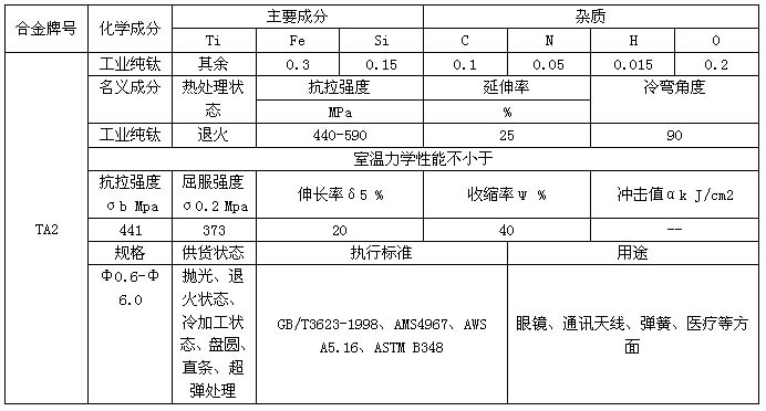 TA2含鈦(Ti)余量,(Fe)0.30,(C)0.10,(N)0.05,(H)0.01[1]5,(O)0.25