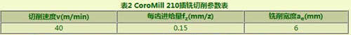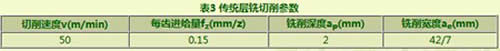 傳統層銑選用可樂滿CoroMill390(刀具直徑42mm,主偏角90°)銑刀,切削速度50m/min,每齒進給量0.15mm/z。為避免刀具受徑向力過大產生切削振動,切削深度不宜過大,推薦值為2mm;槽寬為49mm,顯然層銑加工開槽首刀為滿切寬銑削,即42mm;第2刀銑削寬度為剩余的7mm。層銑開槽的切削參數如表3所示。
