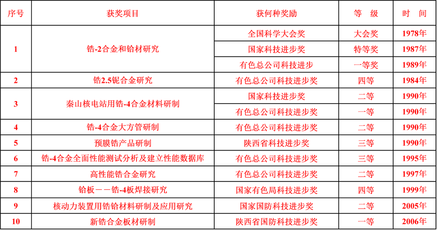 我國于上世紀六十年代開始鋯及其合金材料的研發與生產,主要研究單位是西北有色金屬研究院。1965年西北有色金屬研究院就設立第五研究室,其502組專門從事鋯材研究。發展至1996年,第五研究室整體改制成為鈦合金研究所,下設鈦、鋯、鉿等金屬研究室,期間多次榮獲國家榮譽。(見下表)2004年以鈦合金研究所為主要力量,西北有色金屬研究院成立最大的產業實體——西部鈦業有限責任公司,歷經5年的發展,西部鈦業公司生產的鈦加工材已經牢牢占據了國內前兩名的位置,2009年,西部鈦業有限責任公司開始鋯管材、鋯板材的批量化試制研究和生產。2010年至今,西部鈦業公司作為國產鋯材的領跑者,共生產銷售鋯材240余噸,其中管材80噸,板材160噸,居有色金屬行業之首。
