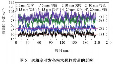 楊義成等人舊引以同軸送粉過程中粉末顆粒和激光發生相互作用過程為研究對象借助高分辨率攝像機,結合圖像二值化處理方法,分析不同工藝參數該過程的影響規律如圖6所示,得出結論:隨著激光功率增加、送粉速率提高,粉末顆粒被激光輻照的面積和數量均呈逐漸增加趨勢。而離焦量提高、載氣流量增加則會使激光輻照總面積逐漸降低。