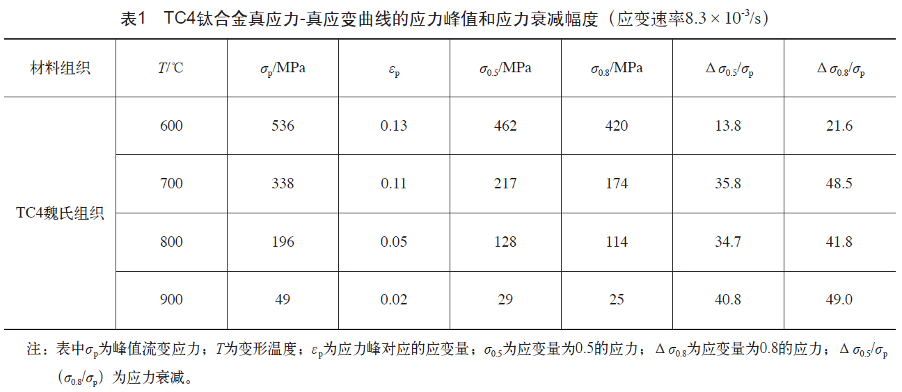 有報道對魏氏組織的TC4鈦合金變形溫度與變形應力之間的關系進行研究,結果顯示[5],當變形時選擇的溫度從600℃升高到900℃時(應變速率為8.3×10-3/s),流變應力峰所對應的應變量εp從0.13減小到0.02,流變應力峰值σp由536MPa下降到49MPa;在此溫度區間,溫度每升高100℃,應力峰值分別下降36.9%、42%和75%,說明隨著變形溫度升高,材料的加工硬化能力顯著減弱,熱變形抗力減小的速度加快。該文獻同時指出,材料在600℃變形時,不發生動態再結晶,材料發生軟化的機制是動態恢復。而在700℃下,變形應力衰減的幅度相對600℃和800℃更大,并接近900℃應力衰減的幅度。由此推斷,在700℃附近變形時,可能發生了動態再結晶,從而導致流變應力隨應變衰減的幅度急劇增大。各溫度下的變形情況見表1 [5]。