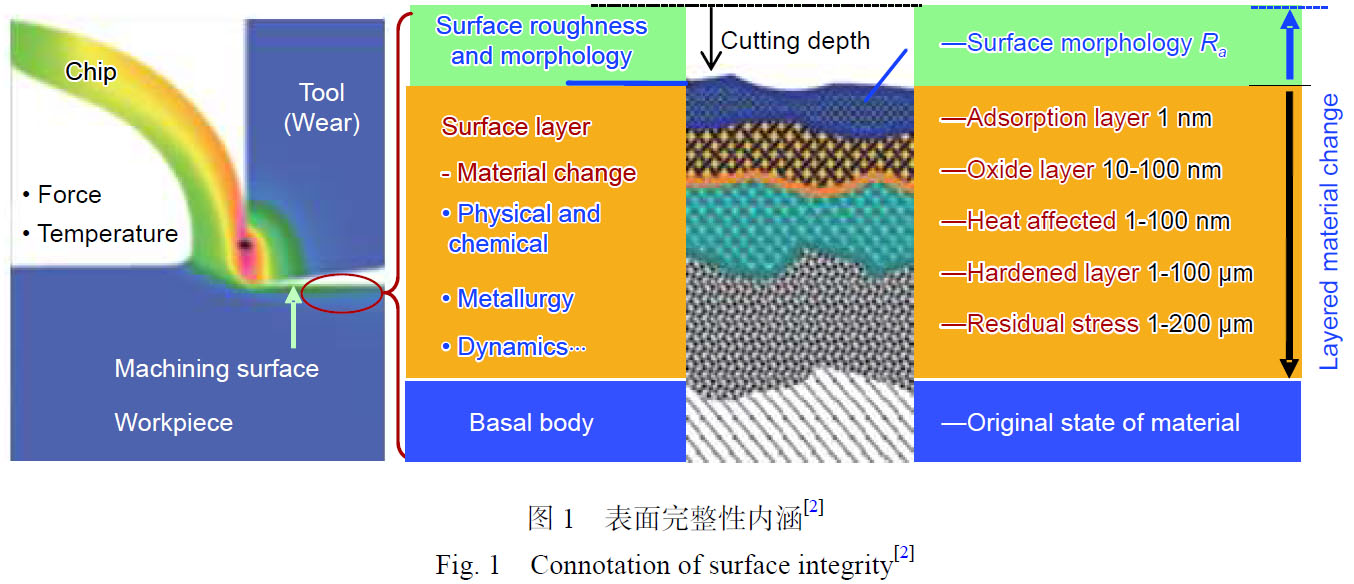航空發(fā)動機作為飛機的心臟,直接影響著飛機的性能、可靠性和經濟性,是一個國家科技、工業(yè)和國防實力的重要體現。現有航空發(fā)動機多采用高強度合金作為其主體結構和主承力構件,其服役能力的強弱取決于加工質量。表面完整性已經發(fā)展為描述、評價和控制零件加工過程在其加工表面和表層內可能產生的各種表面狀態(tài)變化及其對該表面工作性能影響的技術指標[1]。表面完整性是制造加工過程中構件表面和表層材料可能產生的各種改變及其對構件服役性能影響的總體描述和控制,主要包含表面形貌變化和表層材質變化(如圖1所示[2])。表面形貌變化主要包括表面粗糙度、表面形貌/紋理、刀紋方向和裂紋、劃傷、雜質等宏觀缺陷;表層材質變化特征主要包括顯微結構變化、再結晶、晶間腐蝕、熱影響區(qū)、顯微裂紋、硬度變化、塑性變形、殘余應力等[3]。粗糙表面或機械加工引起的刀痕、缺陷等因素會引起很高的表面應力集中,造成工作載荷應力峰值高,直接成為疲勞源;潛伏在亞表層的微結構和微力學的損傷缺陷將急劇加速疲勞裂紋的萌生和擴展,加速疲勞失效;殘余壓應力可以抑制疲勞裂紋的萌生而延長疲勞壽命;提高表面顯微硬度值亦會抑制疲勞裂紋的萌生,但是會加速疲勞裂紋的擴展。可見,疲勞壽命主要依賴于殘余應力和表層微觀結構,殘余應力松弛嚴重時表層組織晶粒細化對疲勞壽命影響占主導。