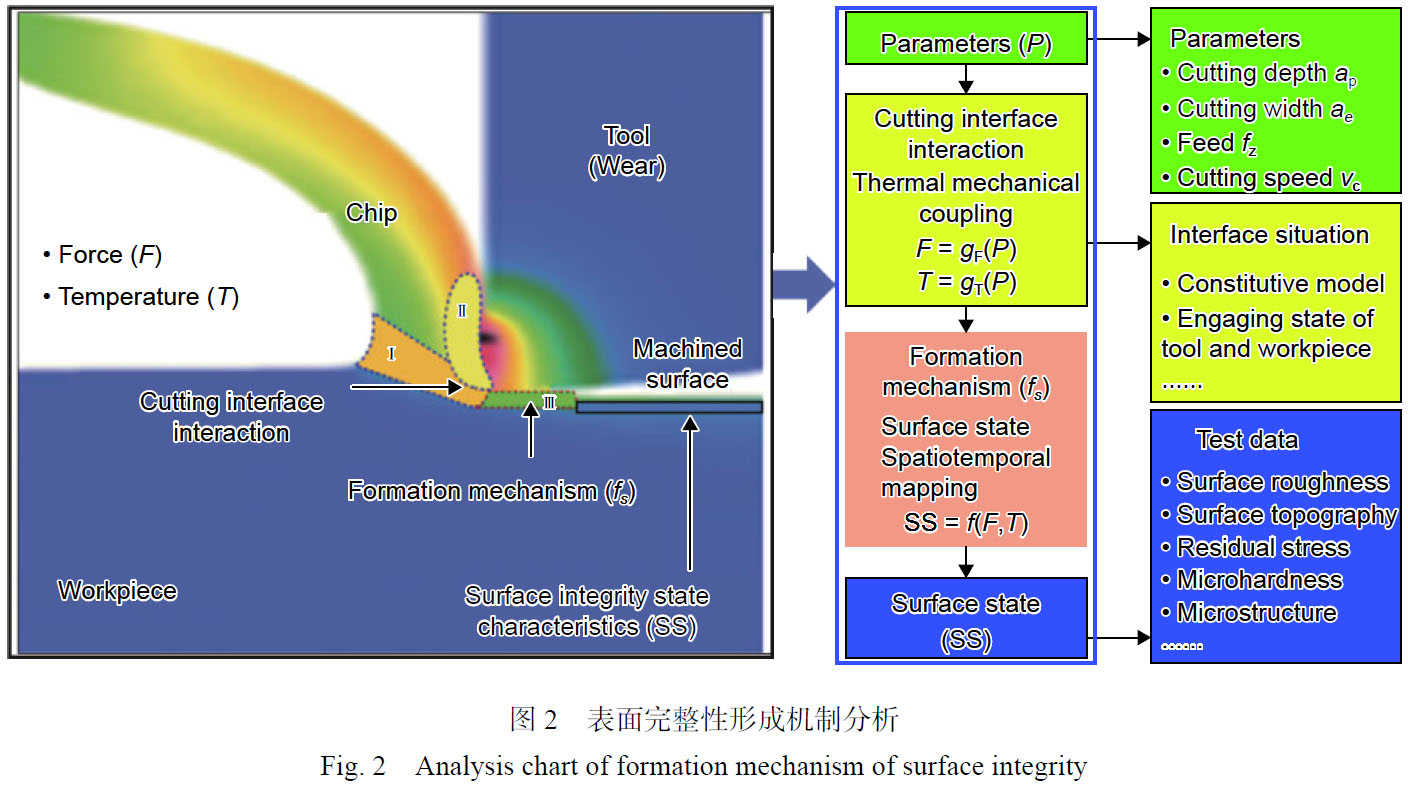 表面完整性形成機制就是描述給定切削工藝因子與切削加工過程中的切削力和溫度,及最終產生的表面完整性狀態(tài)特征之間的關系及其影響機制。如圖2 所示,表面完整性形成過程主要包括兩個階段:第一階段為不同工藝因子下,產生不同的切削力F = gF(P)和切削溫度T = gT(P);第二階段為不同熱力耦合作用下產生不同的表面完整性狀態(tài)特征SS = f(F,T)。在表面完整性形成過程中,切削界面熱力耦合作用不僅受工藝參數、刀具條件、潤滑方式的影響,還受材料性能、刀具-工件嚙合狀態(tài)、輸出響應信號監(jiān)測等界面復雜工況的影響。切削加工過程中的熱力耦合作用使得材料分別在變形區(qū)Ⅰ、Ⅱ、Ⅲ內產生應力、應變,從而使工件表層及亞表層組織、成分、力學性能發(fā)生變化,未得到釋放的切削力和切削溫度轉變?yōu)樽冃文苁构ぜ砻娈a生大塑性變形,同時伴隨著工件表面不均勻的應力和變形,構成了殘余變形區(qū),殘余變形區(qū)的變形儲存能是加工表面微觀組織、加工硬化、殘余應力形成的能量來源。