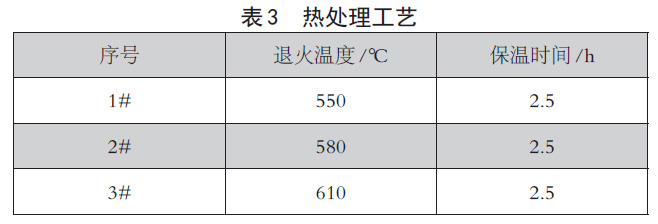 針對δ1.5mm 鋯合金板材校平退火,當退火保溫時間較短時,鋯合金板材內(nèi)應力得不到完全釋放,組織達不到完全再結晶,校平效果較差;而時間較長時,由于在高溫高壓下,鋯合金板材之間易造成粘連,而影響退火板材的平面度,且退火時間過長,易造成水電等能源的浪費。文獻資料[2] 顯示,鋯合金板材退火保溫時間2 ~ 3h 為最佳保溫時間。本文在退火保溫2.5h 的基礎上,根據(jù)不同的退火溫度制定了3種熱處理工藝,如表3 所示。