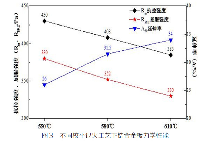 依據(jù)GB/T228.1-2010( 金屬材料拉伸試驗第一部分:室溫實驗方法)對經(jīng)過550 ℃ /2.5h、580 ℃ /2.5h、610℃ /2.5h 校平退火制度處理的鋯合金板材,進行了室溫拉伸性能檢測;檢測結果如圖3 所示。