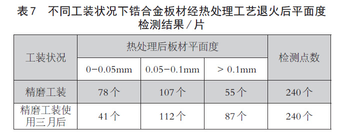 從表7 中可以看出,工裝在多次(長期)使用下,對退火后板材的平面度有著非常大的影響。隨著工裝的使用,在平面度0-0.05mm 范圍內(nèi)所測點數(shù)隨之減少,而在平面度0.05-0.1mm 和平面度> 0.1mm 范圍內(nèi)所測點數(shù)隨之增加。