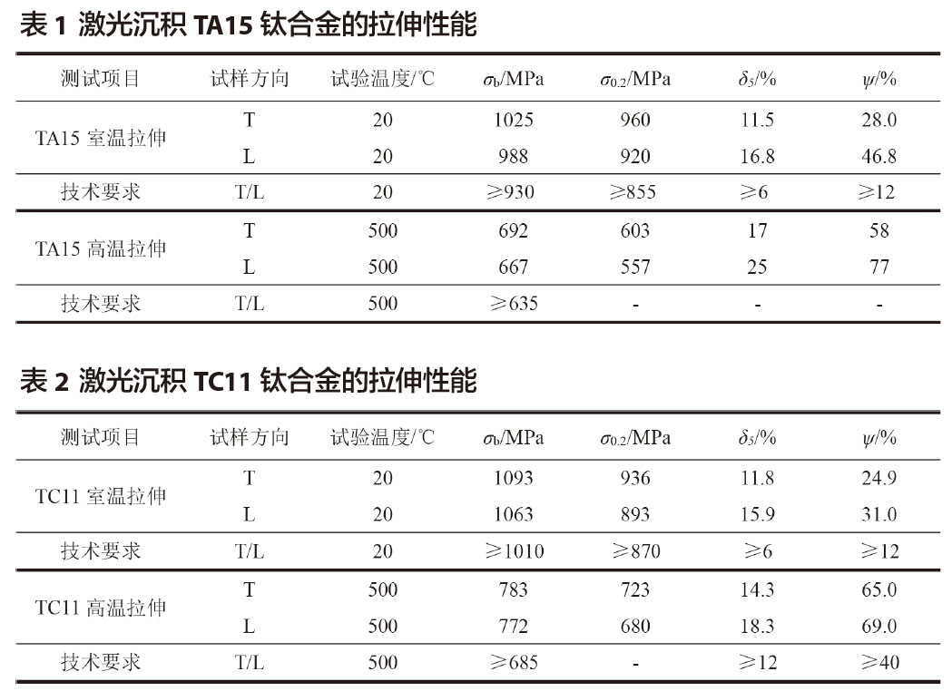在退火狀態(tài)下可用于 500℃以下 500 h和 550 ℃ 以 下 100 h, 以 及 450 ℃ 以 下1000 h ;在強(qiáng)化處理狀態(tài)下可用于 500℃以下 100 h 工作的零件和在 700℃以下一次性工作的零件。該合金對(duì)熱鹽應(yīng)力腐蝕存在著一定的敏感性。主要應(yīng)用于航空發(fā)動(dòng)機(jī)壓氣機(jī)的零部件,如葉片、盤件、鼓筒和軸類等,也可用于制造飛機(jī)結(jié)構(gòu)件,采用激光沉積增材制造技術(shù)制備的TC11 材料的拉伸性能數(shù)據(jù)見(jiàn)表 2。