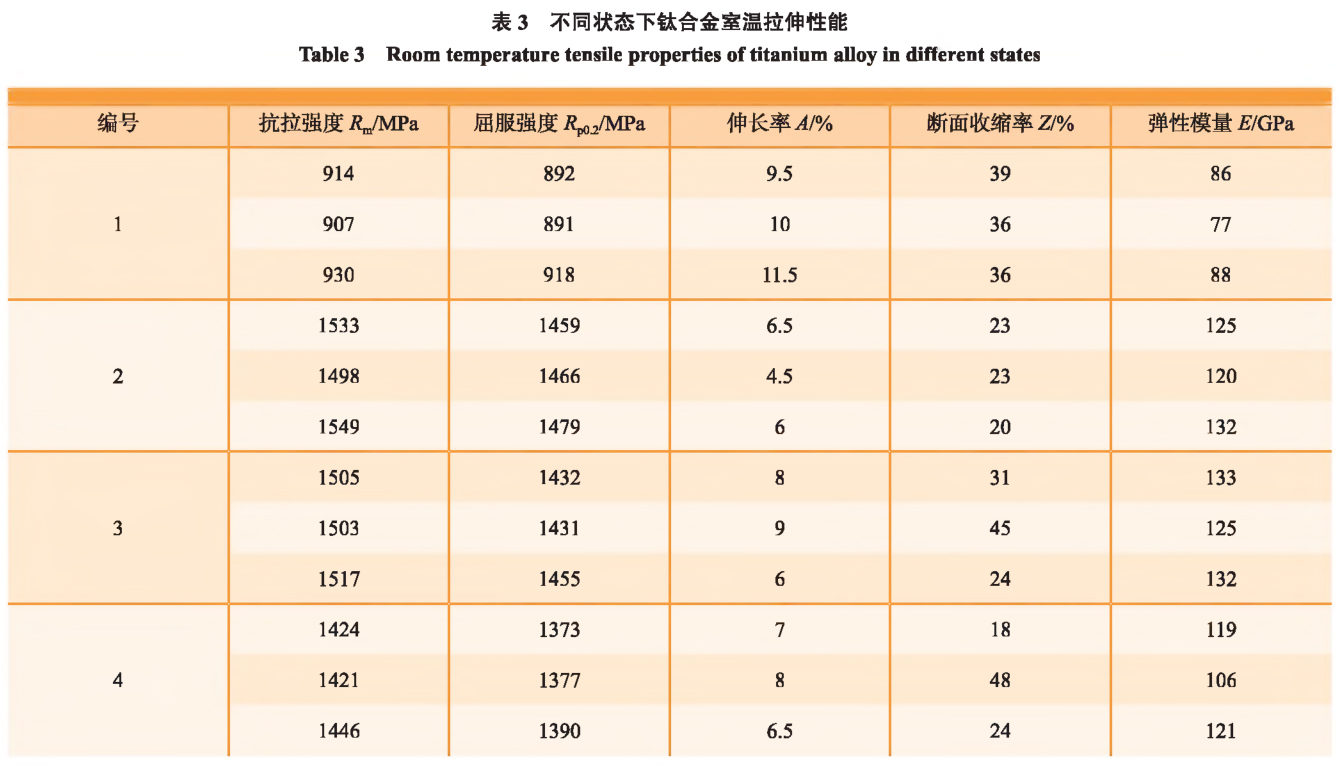 對原材料進行固溶時效處理,試驗方案具體參數如表2所示。制備鈦合金金相試樣,利用Leica DMI5000M光學顯微鏡對其進行顯微組織觀察與分析。在Zeiss Supra-55掃描電子顯微鏡設備上對顯微組織和室溫拉伸斷口的組織形貌進行表征與分析。