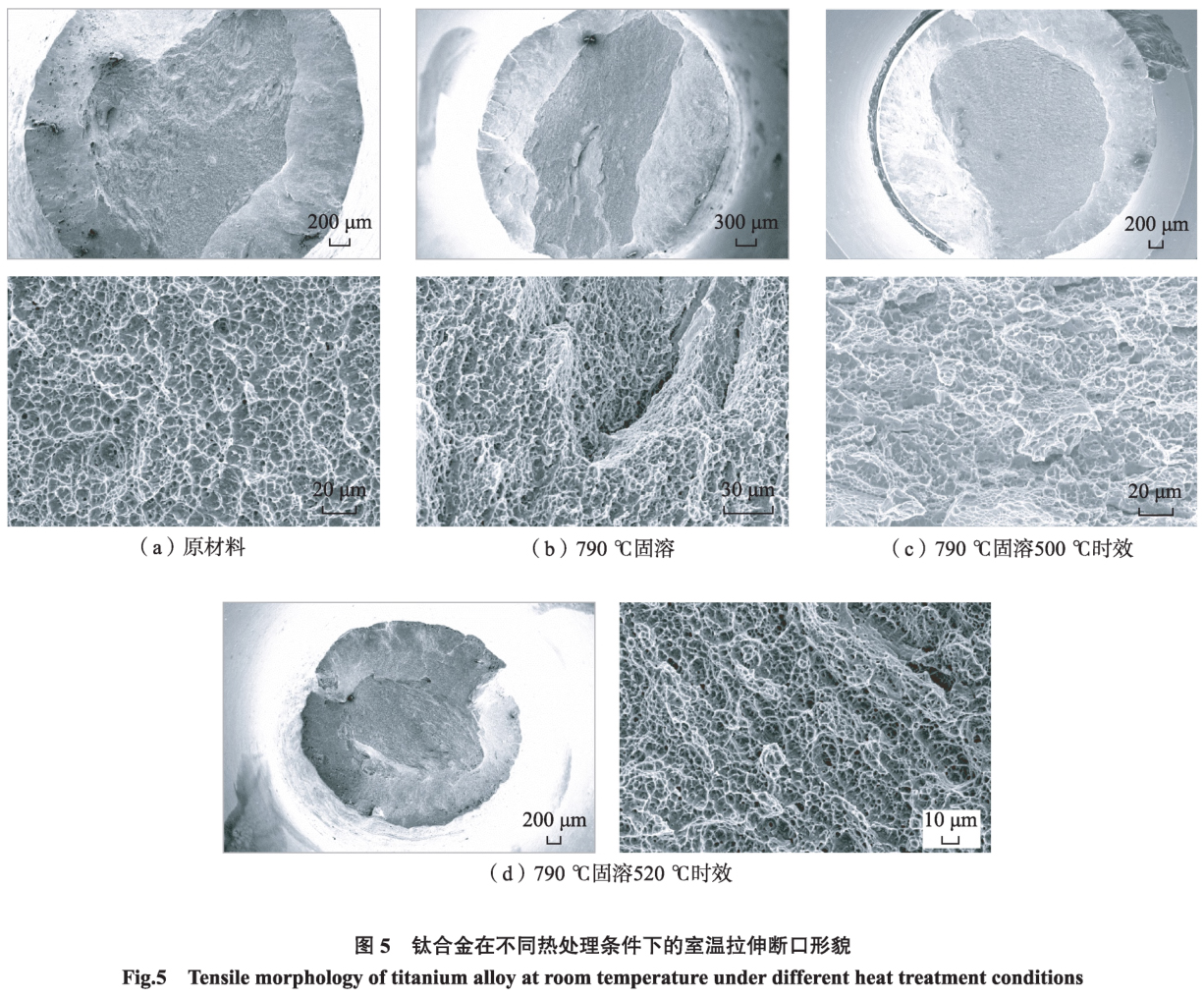 圖5為鈦合金鍛坯原材料、固溶態和固溶時效態合金的拉伸斷口形貌。可知,不同狀態的鈦合金拉伸斷口均呈現典型的杯錐狀特征,拉伸斷口處存在明顯的宏觀塑性變形特征,拉伸斷口表面主要由纖維區和剪切唇區組成;微觀形貌顯示斷口表面均存在大量的等軸狀韌窩。韌窩是合金在微區范圍內經塑性變形產生的顯微空洞,不同熱處理狀態下大量韌窩的存在表明合金均具有一定的塑性和韌性。上述斷口表面的宏觀和微觀特征表明拉伸斷口均為韌性斷裂。鈦合金鍛坯原材料(圖5 ( a) ) 和固溶態合金(圖5 ( b) ) 的拉伸斷口表面纖維區起伏較大,等軸韌窩相對較深,尺寸較大,表明前兩種拉伸樣品的塑性相對較好;500乜時效態(圖5 ( c) ) 和520°C時效態(圖5 ( d) ) 合金拉伸斷口的表面纖維區起伏相對較小,尤其以圖5(C)拉伸斷口的表面起伏最小,等軸韌窩相對較淺,尺寸較小,表明后兩種狀態的拉伸樣品相比于前兩種拉伸樣品,塑性有所降低。上述分析結果與室溫拉伸力學性能結果一致,即鈦合金鍛坯原材料和固溶態合金的塑性優于固溶時效態合金,而且,隨時效溫度的增加,固溶時效態合金的塑性呈增加趨勢。