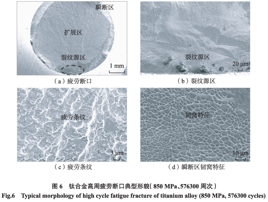 通過對疲勞斷裂后的斷口微觀分析可以研究斷口的形貌,分析材料斷裂類型和性質、斷裂模式、斷裂路徑、斷裂原因和機理,在理論研究和工程實踐中都有著十分重要的作用。斷口 SEM分析發現,試驗中所有試樣疲勞斷口均顯示出典型的高周疲勞斷口特征,整個斷口分為裂紋源區、穩定擴展區和瞬斷區,如圖6所示,該樣品最大應力為850 MPa,疲勞壽命為576300周次。