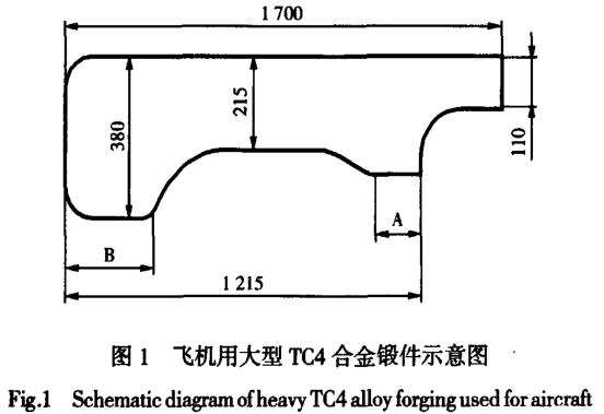 某型號飛機發動機掛架用TC4鈦合金鍛件尺寸大(單重142 kg,長度1700mm,寬度380mm),形狀復雜,對探傷及性能要求高。采用模鍛的方法生產需要的設備噸位大。采用自由鍛方法生產,由于鍛件的尺寸大,組織很難控制。且國內無此類鍛件成熟的生產工藝可供鑒。為此,本實驗探討了在水壓機上自由鍛制坯、胎模鍛成形、鍛制TC4合金大型鍛件的生產工藝,為航空用大型鈦合金鍛件的工業化生產提供工藝參考。