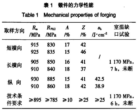 從表1可以看出,采用本實驗研究的鍛造工藝制備的鍛件力學性能良好,完全滿足技術條件要求。