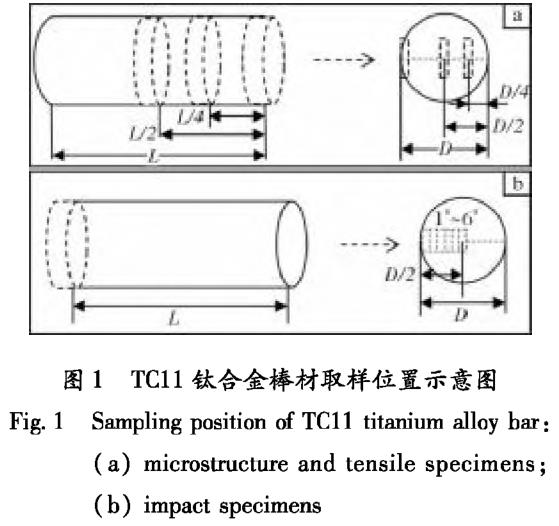 對TC11鈦合金棒材進行970℃/120 min/AC +530 °C/360 min/AC熱處理。按圖1a所示,沿棒材長度(Z)方向分別在L、L/4、L/2處截取0200 mmx20mm盤片,每個盤片沿直徑(D)方向分別在D/4、D/2處取金相試樣和拉伸試樣。采用OLYM-PUS PLAG3光學(xué)顯微鏡進行顯微組織觀察。采用INSTRON 8985萬能試驗機進行室溫、高溫拉伸性能試驗。按圖1b所示,在棒材另一端Z處沿D至D/2處平均取6個沖擊試樣,標記為1#~ 6%采用ZBC2602-CE沖擊試驗機進行夏比沖擊試驗(U型缺口),測量試樣的沖擊韌性。