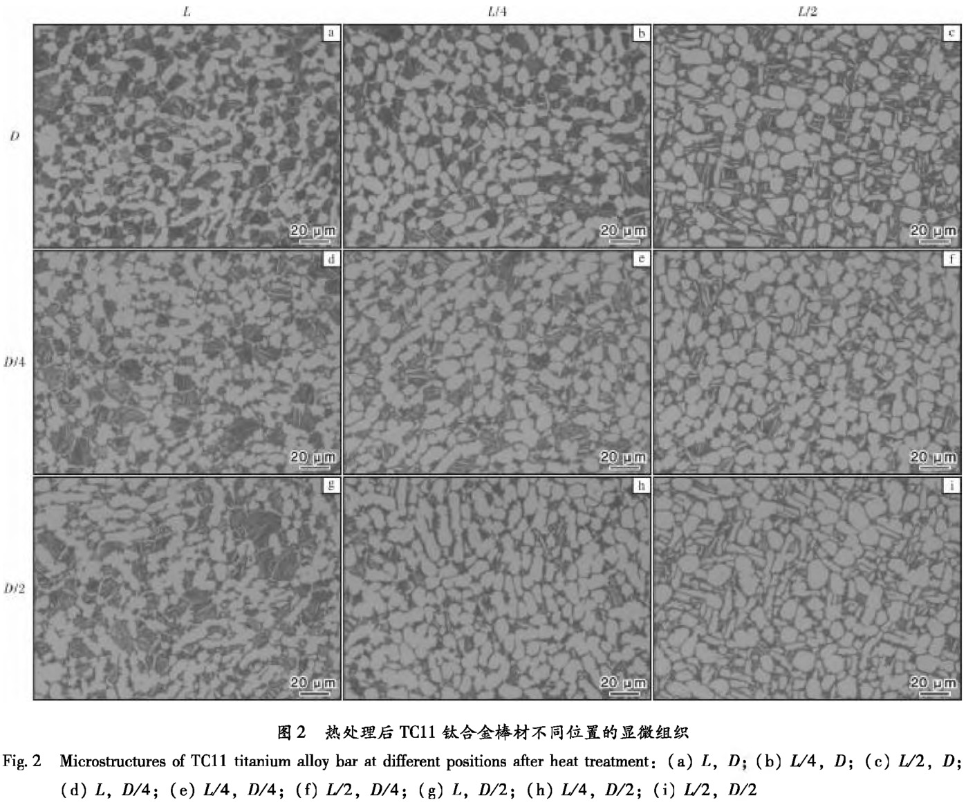 顯微組織主要與TC11鈦合金棒材熱處理過程中的溫度變化有關(guān)。TC11鈦合金的導(dǎo)熱性較差,在熱處理過程中存在一定的溫度梯度,在長度和直徑方向上越靠近心部,棒材的冷卻速度越慢,使得初生珀相和次生乂相有足夠的時間緩慢長大,越靠近棒材表面,熱處理后冷卻速度越快,α相來不及長大,同時可以將更多的β相保留下來。
