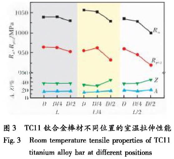 (2) 大規(guī)格TC11鈦合金棒材不同位置的室溫拉伸性能變化與顯微組織密切相關(guān)。沿長度方向,D/2處的顯微組織差異最為明顯,室溫拉伸性能表現(xiàn)為由邊部至心部抗拉強度逐漸降低,塑性升高。