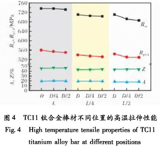 圖4為TC11鈦合金棒材不同位置的高溫拉伸性能。從圖4可以看出,TC11鈦合金棒材的高溫抗拉強度表現(xiàn)出沿不同方向越靠近心部,強度越低。鈦合金的高溫拉伸行為較室溫拉伸行為更加復(fù)雜,受多種因素影響,但也主要與顯微組織有關(guān)。如前所述,沿長度方向越靠近1/2處,初生αp相、次生αs相含量增加,β相含量降低。觀察厶處沿直徑方向顯微組織變化規(guī)律可以發(fā)現(xiàn),越靠近D/2處,初生αp相和β相晶粒長大越明顯。αp相含量增加會降低高溫抗拉強度,同時,次生匕相片層厚度增加、方向性增強,β晶粒尺寸長大等顯微組織的變化,也都會造成高溫抗拉強度的降低⑻。從圖4還可以看出,棒材不同位置的高溫塑性變化不大,說明顯微組織變化對高溫塑性的影響較小。