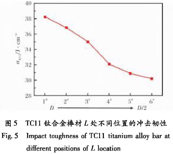 圖5為熱處理后TC11鈦合金棒材L處不同位置的沖擊韌性。從圖5可以看出,沿棒材直徑方向,越靠近心部,沖擊韌性越低。對比厶處不同位置顯微組織可以發(fā)現(xiàn),由D處到D/2處,棒材的初生αp相和次生αs相晶粒逐漸長大,含量增加,對應(yīng)把β相含量逐漸減少。初生αp相界有利于微裂紋的形核⑼,因此,初生αp相含量增加,TC11鈦合金棒材的沖擊韌性降低。