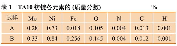 試驗(yàn)采用新疆湘潤(rùn)新材料科技有限公司生產(chǎn)的TA10鑄錠,按2種方案配料,經(jīng)真空自耗電弧爐2次熔煉,熔煉完成后從鑄錠中部取樣,進(jìn)行成分分析,各元素含量見表1,可以看出,試樣A中Mo、Ni、Fe、O等合金元素及雜質(zhì)元素含量均較低,試樣B提高了主要合金元素和雜質(zhì)元素的含量,引入較多量雜質(zhì)元素的Fe。