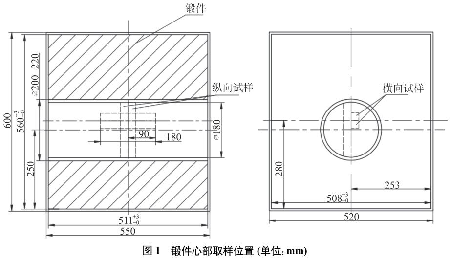 鍛件采用符合AMS2750E要求的四級(jí)爐(爐溫均勻性±14°C)進(jìn)行加熱及熱處理,在45MN快鍛機(jī)上鍛造,鑄錠經(jīng)由相變點(diǎn)上鐓拔開坯,然后進(jìn)行相變點(diǎn)下多火次鐓粗—拔長(zhǎng)鍛造,變形速度60mm/s,每次鐓粗變形量分別為30%、40%、50%,終鍛溫度控制在650~700°C,鍛后坯料經(jīng)600°C保溫3h,空冷后,分別從方坯的最心部切取橫縱向拉伸及顯微組織試樣,取樣位置見圖1,經(jīng)數(shù)控車床按ASTME8要求加工成ϕ12.5mm的標(biāo)準(zhǔn)拉伸試樣,采用CMT5205電子拉伸試驗(yàn)機(jī)測(cè)定拉伸性能,采用舜宇光學(xué)ICX41M倒置式金相顯微鏡觀察顯微組織。