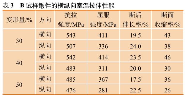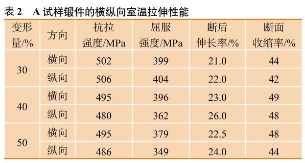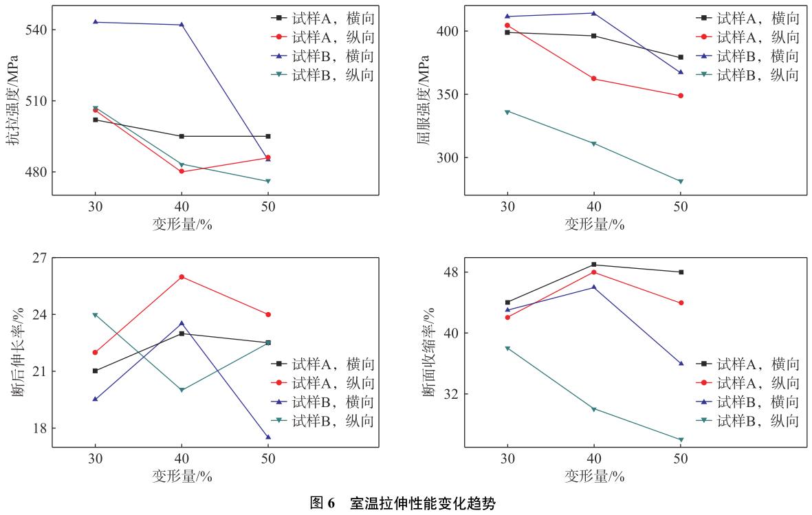 兩種試樣的橫、縱向室溫拉伸各項(xiàng)指標(biāo)的變化趨勢(shì)見圖6,可以看出,A、B兩種試樣的鍛件強(qiáng)度隨變形量的增加而減少,塑性指標(biāo)A試樣明顯高于B試樣,但B試樣在小變形量下的橫向強(qiáng)度、塑性均達(dá)到最高,各向異性明顯。