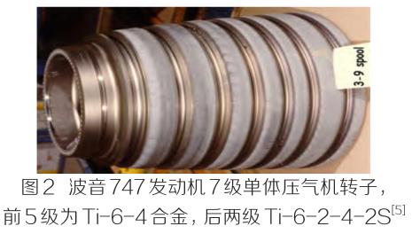 目前波音787的GEnx發動機以及空客A-320NEO和波音737MAX的CFMLEAP發動機最后兩級低壓渦輪(LPT)工作葉片均釆用ϒ合金Ti-48Al-2Nb-2Cr制造。 使用這種合金使GEnx發動機每級葉片減重約90kg。2006年美國GE公司使用Ti-48Al-2Nb-2Cr合金作為在GEnx發動機中第6、7級低壓渦輪葉片。這是鈦鋁合金首次大規 模進入實際關鍵結構件的應用[27]。圖7為用ϒ合金制造的GEnx發動機低壓渦輪轉子。