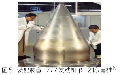 β-21S(Ti-15Mo-2.7Nb-3Al-0.2Si)是TIMET開發的一種超高強度新型β合金。該合金強度高,塑性好,通過熱處理,時效到很高的強度水平(抗拉強度>1450MPa),塑 性仍保持在Ti-1023的水平。β-21S在加工和使用期間具有顯著的抗氧化性能,更適合加工成薄板。β-21S比其它β合金能承受更高的溫度,長時間工作溫度可達540℃[26]。 由于具有更好的耐高溫性能,這種合金可以用作航空發動機尾椎,如圖5所示,此處噴口暴露于發動機尾氣。用β-21S代替鎳基合金可以大幅度減輕噴口和尾椎的重量。