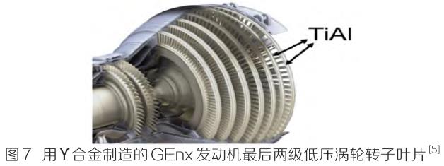 鈦鋁合金,比近α型鈦合金具有更好的耐高溫性能。鈦鋁合金有多種金屬間化合物,主要有Al含量較少的Ti3Al(α2)和Al含量較多的TiAl(ϒ)兩種。其中ϒ合金耐高溫 能力達到725℃,高于常規鈦合金的工作溫度。目前已有ϒ合金用于發動機制造,在商用飛機發動機中用作低壓渦輪葉片,如圖6所示。