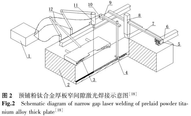 針對中厚板鈦合金激光焊存在的問題,很多焊接工作者進行了相關的研究,并提出一些改進的措施。南京航空航天大學的田德勇[15]將激光焊焊縫中的氣孔分為兩類:工藝氣孔和冶金氣孔。其研究結果表明:工藝氣孔的形成與匙孔的穩定性有關,冶金氣孔與焊縫內氫元素的遷移和金屬蒸汽有關。但從總體上來看,焊縫的氣孔率隨著熱輸入的增大而減小,且當焊接速度較快時,基本不形成工藝氣孔。這將為解決鈦合金激光焊氣孔問題提供理論依據。哈爾濱工業大學的孟盛昊等[16]通過對比大氣中和真空中中厚板鈦合金激光焊的焊縫,結果表明:真空中鈦合金激光焊的焊縫表面成形更好,焊縫熔深更大,焊縫中的氣孔更少。這為解決中厚板鈦合金激光焊存在的問題提供了新的思路。哈爾濱焊接研究院的Fang等[17]利用激光可達性好的特點進行厚板鈦合金激光焊的研究,為厚板鈦合金激光焊提供了新的思路。中船重工725所的盧曉陽等[18]提出一種基于預鋪粉的鈦合金厚板窄間隙激光焊接方法,如圖2所示。該工藝方法是先在窄間隙內預鋪一層一定厚度的金屬粉末,然后再進行激光熔化焊。這樣逐層焊接,最終填滿整個坡口。該焊接方法可以顯著減少焊縫內的氣孔和未熔合等缺陷,同時提高焊縫成形的穩定性?傊,中厚板鈦合金激光焊的研究還不夠深入,存在的很多問題還沒有得到很好的解決,導致中厚板鈦合金激光焊接工藝在生產上的應用還比較少。