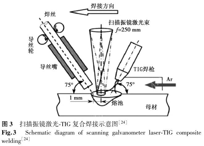 大連理工大學的呂曉輝[22]利用低功率的激光誘導TIG電弧,針對鈦合金復雜構件進行焊接時發現:低功率的激光會將TIG電弧誘導至激光斑點處,引起TIG電弧收縮,提高TIG電弧的穿透能力,增大焊接熔深。該焊接方法有助于提高焊接生產效率、降低焊縫的熱輸入,但激光與電弧之間的作用機理仍需深入研究。中國航空制造技術研究院的許飛等[23⁃24]將掃描振鏡激光與TIG焊復合起來,研究其對鈦合金焊縫成形的影響,如圖3所示。掃描振鏡激光就是通過在激光頭內部設置掃描振鏡系統,實現激光的高頻掃描。高頻掃描的激光可以加強對熔池的攪拌,改善焊縫組織,提高接頭力學性能。其研究結果表明:焊縫的熔寬主要受TIG焊接電流的影響,而焊縫的熔深主要受激光功率的影響,且若要焊接過程無明顯飛濺,焊接電流需要達到一定值,該值與激光熱輸入呈負相關的關系。