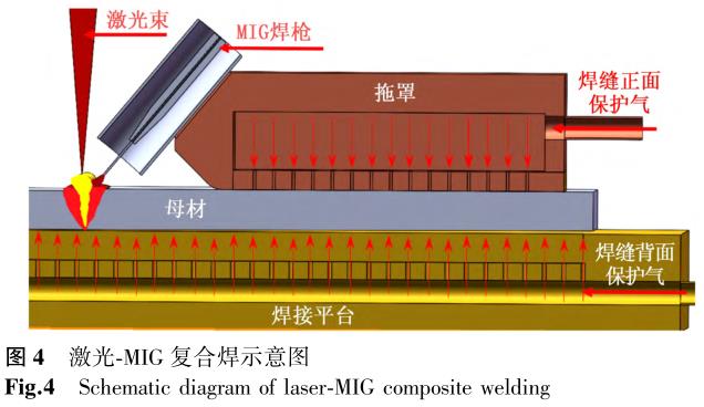 激光⁃MIG復合焊是一種高效、優質的焊接方法。該焊接方法兼具激光焊和MIG焊的優點。圖4所示為激光⁃MIG復合焊示意圖,焊接過程中激光與MIG電弧耦合,激光可以吸引和壓縮電弧,提高電弧的能量密度。MIG電弧可以稀釋光致等離子體,削弱光致等離子體對激光的反射,提高激光能量的利用率。激光⁃MIG復合焊相對傳統的激光焊,提高了焊接過程搭橋的能力,對被焊工件的加工精度和裝夾精度的要求大大降低,并且在較小的熱輸入量條件下可以獲得較大的焊接熔深[27]。該技術主要應用于中厚板的焊接,已經在軌道客車、航空航天、工程機械、船舶制造等領域獲得應用。目前對于鈦合金激光⁃MIG復合焊的研究主要集中在中厚板的對接焊方面。江蘇科技大學的禹杭[28]針對6mm、8mm、10mm厚度的純鈦板材進行焊接工藝試驗,通過調整焊接工藝參數,三種厚度的板材均可以實現穩定的單面焊雙面成形焊接工藝,焊縫成形優良,未出現飛濺、咬邊等缺陷。中國兵器科學研究院寧波分院的張龍等[29]針對15mm厚的TC4板材進行了激光⁃MIG復合焊的多層多道焊接工藝試驗和接頭力學性能分析,實現了60°坡口、5mm鈍邊的打底焊,且焊縫成形美觀。在后續的填充焊和蓋面焊中均實現了良好焊接,獲得了高質量的焊縫。