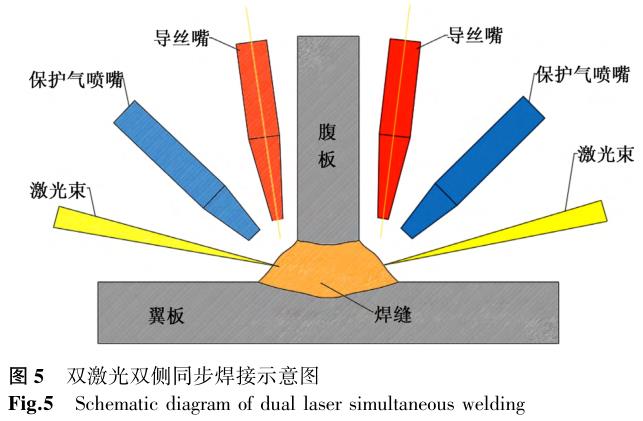 隨著激光焊接技術的進步,為了提高T型接頭的激光焊接效率和接頭質量,提出了雙激光雙側同步焊接技術(Doub⁃lelaserBeambilateralsYnchronousWelding,簡稱DLBSW),如圖5所示。該技術目前已被大量應用于航空航天領域蒙皮⁃桁條T型結構的連接中,替代了常規的鉚釘連接和機械連接,大大減輕了結構的整體質量,改善了結構件的氣密性,顯著提高了生產效率。自2000年空客將DLBSW技術應用于A318客機整體機身壁板的制造中以后,已先后將該技術引進到A340、A350、A380等客機的制造中,取得了顯著的經濟效益[36⁃38]。