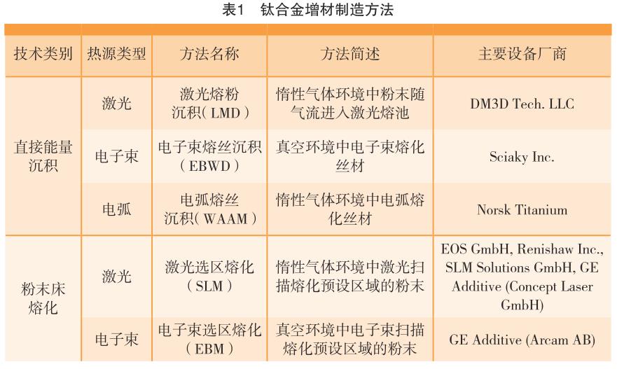 鈦合金的增材制造可分為直接能量沉積與粉末床熔化兩個技術類別,再根據熱源的不同,如今形成了激光熔粉沉積(Laser MetalDeposition, LMD)、電 子 束 熔 絲 沉積(Electron Beam Wire Deposition,EBWD)、電 弧 熔 絲 沉 積(Wire ArcAdditive Manufacturing, WAAM)、激光選區熔化(Selective Laser Melt-ing, SLM)、電子束選區熔化(ElectronBeam Melting, EBM)5 種主要方法(表1)。