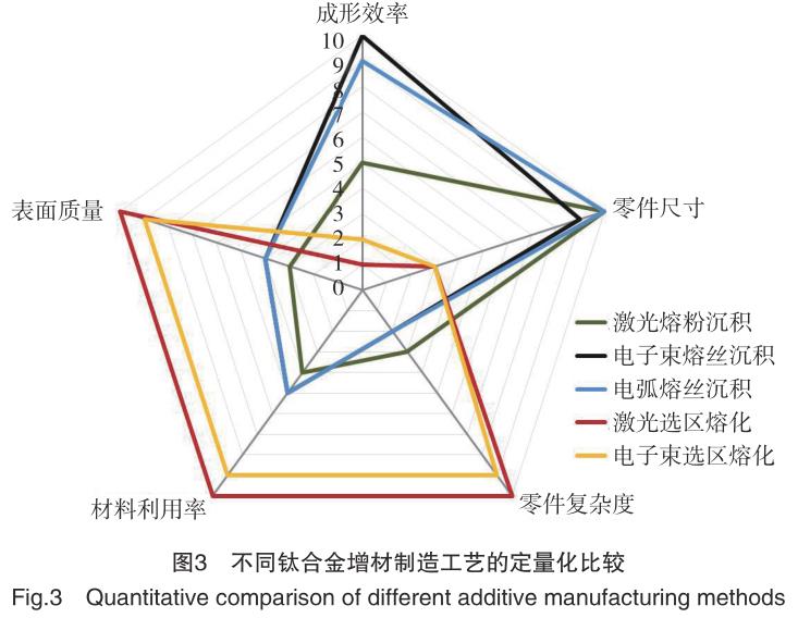 直接能量沉積技術效率高,平臺柔性好,成形零件的尺寸大,還可在原有零件上進行修復和再制造,但缺點是不具備制造復雜空心結構的能力,成形的毛坯還需要經過較多的機 械加工才能獲得最終零件。值得一提的是,激光熔粉沉積方法還能同步混合不同材料的粉末來實現復合材料的成形。相比之下,選區熔化技術的最大優點是其復雜精密結構的成 形能力(如帶有內流道的葉片或空間點陣結構),然而零件尺寸受到成形腔空間的限制。從熱源的角度來說,電子束需要在真空環境中運行,雖然成本較高,但成形過程中殘余應力小,成形零件通常無須退火;而激光或電弧在惰性氣體環境中運行,冷卻速度快,成形零件殘余應力較高。表2 列舉了 5 種增材制造工藝及其成形零件的特點,從 5 個量化維度(圖3)來看,這幾種工藝各有優勢,重要的是根據所需成形零件的特點來選擇與之適應的工藝。直接能量沉積技術(LMD, EBWD,WAAM)適合于大型零件毛坯的快速成形,而粉末床熔化技術(SLM, EBM)適合于小型復雜零件的精密成形。