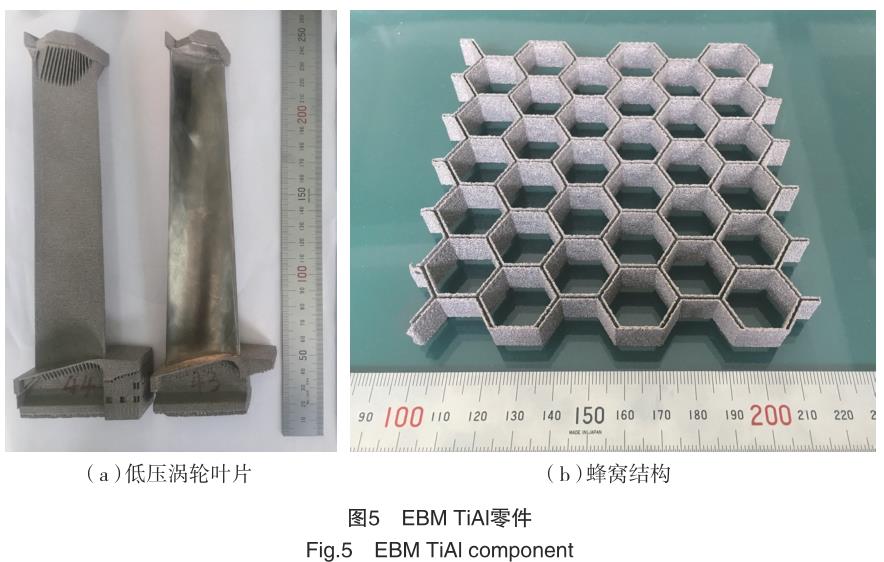 在國內,航空工業制造院、北京航空航天大學、西北工業大學等單位在航空鈦合金增材制造技術研發與應用方面處于領先地位,涉及的鈦合金材料包括 Ti-6Al-4V、TA15、 TC11、TC18、TC21 等,多個零件實現了裝機應用[12,18]。此外,航空工業制造院還實現了 TiAl 低壓渦輪葉片與蜂窩結構的 EBM 制造(圖 5)[19]。