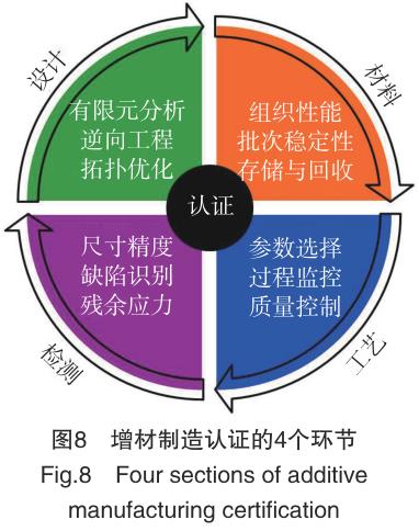在對可靠性要求極高的航空制造業中,成形工藝與零件質量的認證是必須要解決的問題。圍繞著增材制造的認證過程有設計、材料、工藝、檢測 4 個環節,針對每個環節中的各 項內容建立標準是增材制造零件質量控制的關鍵(圖 8)。最終的目標是固化成形工藝,并且材料性能穩定地達到設計許用值。