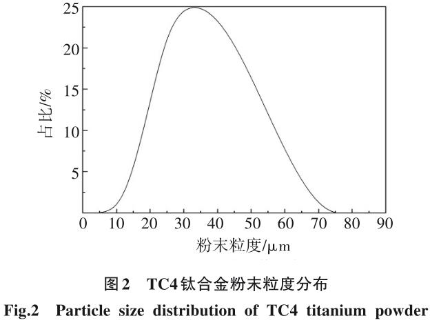 本文所用 TC4 鈦合金粉末的化學(xué)成分如表 1 所列,對應(yīng)的粉末形貌如圖 1 所示,可見粉末具有良好的球形度,衛(wèi)星球較少。TC4 鈦合金粉末的粒度分布如圖2所示,粒度分布范圍主要為15~53 μm,D10、D50 和 D90 分別為 17.77、31.19、49.92 μm。采用型號為 Concept Laser M2 的 SLM 成形設(shè)備制備內(nèi)含人工植入缺陷的 TC4 鈦合金樣品,為了降低成形過程的熱應(yīng)力,采用島狀曝光成形策略,成形工藝參數(shù)為激光功率 375 W,掃描速度 1 500 mm/s,層厚 0.05 mm和掃描間距0.095 mm。
