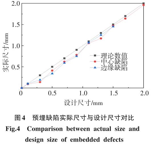 利用 Micro-CT 檢測技術(shù)對 SLM 制備 TC4 鈦合金中預(yù)埋缺陷的尺寸和形貌進(jìn)行了檢測分析,圖 4是缺陷的實際測量尺寸與設(shè)計尺寸之間的對比圖。從圖 4 中可以發(fā)現(xiàn)成形合金中缺陷實際尺寸低于設(shè)計尺寸,同時無論是缺陷位于成形合金樣品的中心位置還是邊緣,該現(xiàn)象不會發(fā)生改變。這是由于 SLM成形過程合金粉末在缺陷位置因不會被高能激光束 掃描到而發(fā)生收縮,同時孔洞內(nèi)粉末會被包裹和殘留在預(yù)制缺陷內(nèi),在后續(xù)的打印過程中不能排出,熱處理后在孔洞缺陷表面燒結(jié),使得測試尺寸小于原始設(shè)計的尺寸[25]。