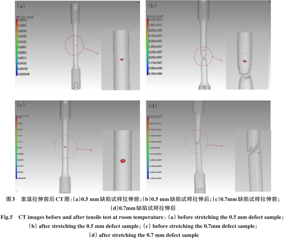 圖 5(a)和圖 5(b)為內(nèi)含缺陷在中心位置尺寸為0.5 mm 的試樣拉伸實驗測試前后的 CT檢測圖像,從圖中可以發(fā)現(xiàn),拉伸試樣未從預(yù)埋缺陷處斷裂,預(yù)埋缺陷在拉伸前后均可被清晰地觀察到。從圖 5 所示的拉伸前后 0.5 mm 缺陷部位的放大圖中發(fā)現(xiàn),除了內(nèi)置的人工缺陷,還存在少量的自然缺陷,這些微米級缺陷的存在是增材制造過程中不可避免的。