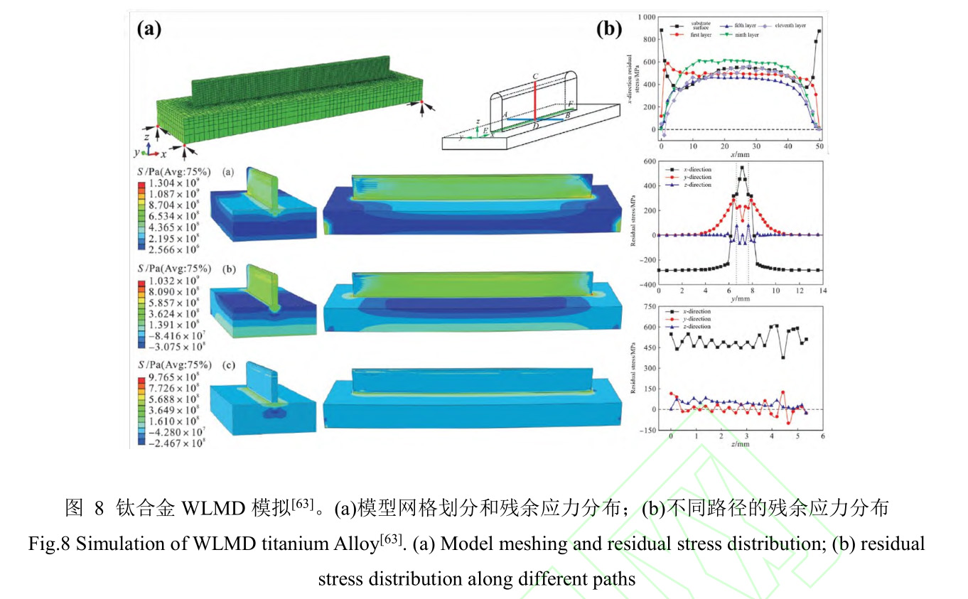 激光增材制造成形過程中繁雜的熱循環以及殘余應力分布,會在沉積層中產生較為嚴重的變形甚至開裂,從而對性能產生關鍵的影響,而數值模擬是解決該類問題的有力工具。任朝暉等[63]對鈦合金WLMD過程中的溫度場和應力場開展了模擬研究,采用ABAQUS軟件建立完全熱力耦合的有限元模型,研究了Ti-6Al-4V單道多層沉積件的熱循環特性和應力分布,如圖8所示,發現隨著沉積層數的增加,熱累積效應逐漸變強,且冷卻速率下降;薄壁沉積件整體的殘余應力為拉應力狀態,x方向明顯大于另外兩個方向,然而垂直于掃描方向較易產生裂紋等缺陷;同時,中部殘余應力相對穩定,最大殘余應力集中在沉積層兩端與基板交界處。