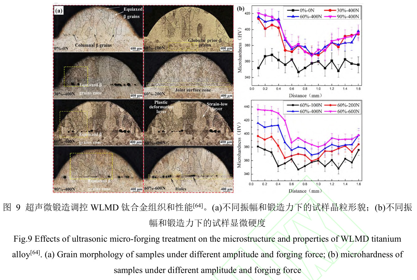 為了進一步調控組織性能,Ye等[64]利用超聲微鍛造對WLMD鈦合金進行研究,結果表明,振幅和鍛造力會使得Ti-6Al-4V試樣中出現大量等軸β晶粒,其形態也可以通過工藝參數進行控制,如圖9所示,隨著振幅的增大,等軸β晶粒平均尺寸減小;隨著鍛造力的增加,沉積層與基板界面處的缺陷數量增加,但顯微硬度也隨之增大。Yang等[65]研究了超聲沖擊前后成形樣品的變化,發現超聲沖擊后的樣品殘余應力遠低于沉積態樣品,同時提高了拉伸強度,但伸長率有所降低。Donoghue等[66]將軋制與沉積進行工藝復合,發現每一層沉積后只需較低的變形量就能顯著地減小晶粒尺寸,并且β和α相織構也大幅降低到接近隨機分布,同時這些破碎晶粒可以在后一層沉積過程中再次加熱時作為再結晶晶核。Sabban等[67]通過在接近但低于β轉變溫度的條件下循環熱處理TC4鈦合金,使得針片狀α相逐漸轉變為球狀,球形化雙相組織將沉積試樣的延展性提高了80%,韌性提高了66%。除此之外,還有固溶時效熱處理[68,69]、電脈沖熱處理[70]和等通道角擠壓[71]等方式來改善合金組織,從而對力學性能進行調控。