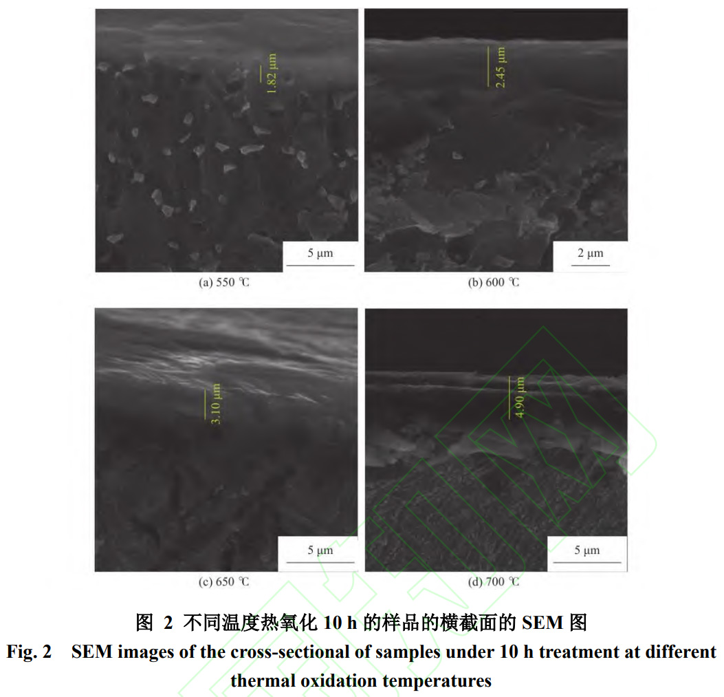 圖1為不同溫度熱氧化10h的樣品表面的SEM圖。從圖1中可以發現,550℃時只有少許氧化顆粒覆蓋在樣品表面,600℃時有較多的薄而小的氧化鱗片,當溫度達到650℃時,氧化顆粒完全覆蓋在樣品表面且比較致密。在700℃時,樣品中由于氧化物的團聚,氧化顆粒較650℃時的有明顯的增大,晶粒之間的間隙變大。樣品表面氧化層開始變得疏松多孔。可以發現,隨著熱氧化溫度的升高,氧化物顆粒逐漸向外生長并且逐漸覆蓋整個表面。而當溫度繼續升高,氧化物顆粒繼續長大,由于氧化物顆粒的生長方向的不一致,從而導致樣品表面微觀形貌中空隙的出現。從圖1(d)中可以看出,氧化膜之間的襯度相差較大,呈現出凹凸不平的狀態。由圖2可知,550、600、650、700℃時氧化層的厚度分別為1.82、2.45、3.1、4.9μm。在較低溫度下,形成的氧化層較薄且增長速度緩慢?傮w來看,氧化層的厚度隨著熱氧化溫度的升高而增加。