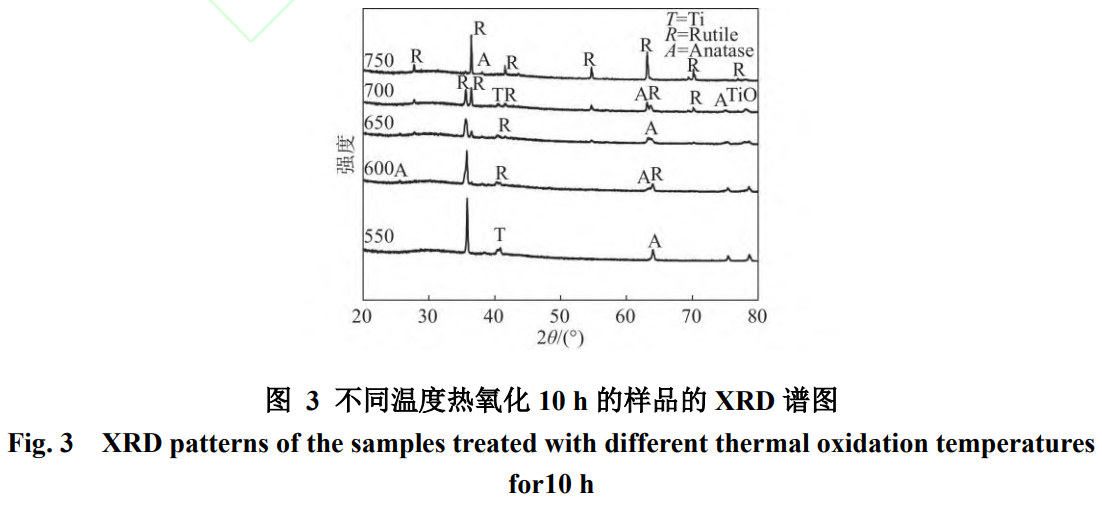 不同溫度熱氧化10h的樣品的XRD譜圖如圖3所示。從圖3中可以看出,經熱氧化后的樣品表面主要由Ti峰,銳鈦礦型TiO2和金紅石型TiO2以及氧擴散相TiO相組成?梢园l現550℃時主要由銳鈦礦型和Ti峰組成,僅有少量的金紅石型,隨著溫度的升高,試樣中的銳鈦礦型向金紅石型轉化,并且Ti峰的強度開始降低,金紅石峰占據主導地位。