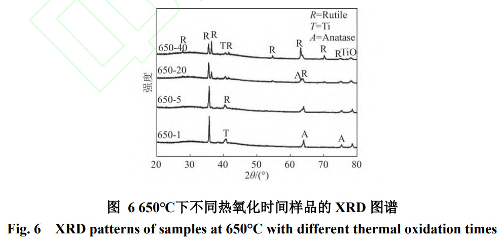 圖6為650℃下不同熱氧化時間條件下獲得的樣品的XRD圖譜,由圖可以發現,隨著熱氧化時間的增加,表面的銳鈦礦相和Ti峰減弱并向金紅石相轉變,金紅石相峰值增強,即金紅石相的含量在逐漸增多。說明在一定加熱溫度下,適當延長保溫時間有利于金紅石相的形成。